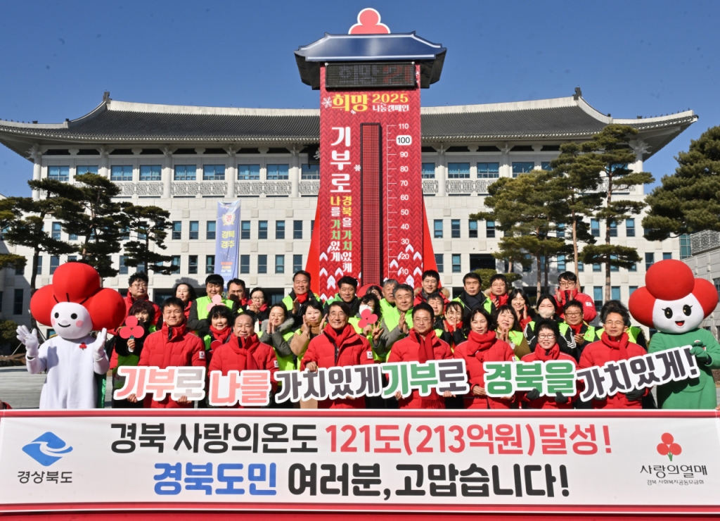 경북도는 3일 희망2025나눔캠페인이 최초 200억원을 돌파해 총 213억원의 성금 모금으로 사랑의 온도 121도를 기록하는 역대 최대 성과를 달성했다고 밝혔다.