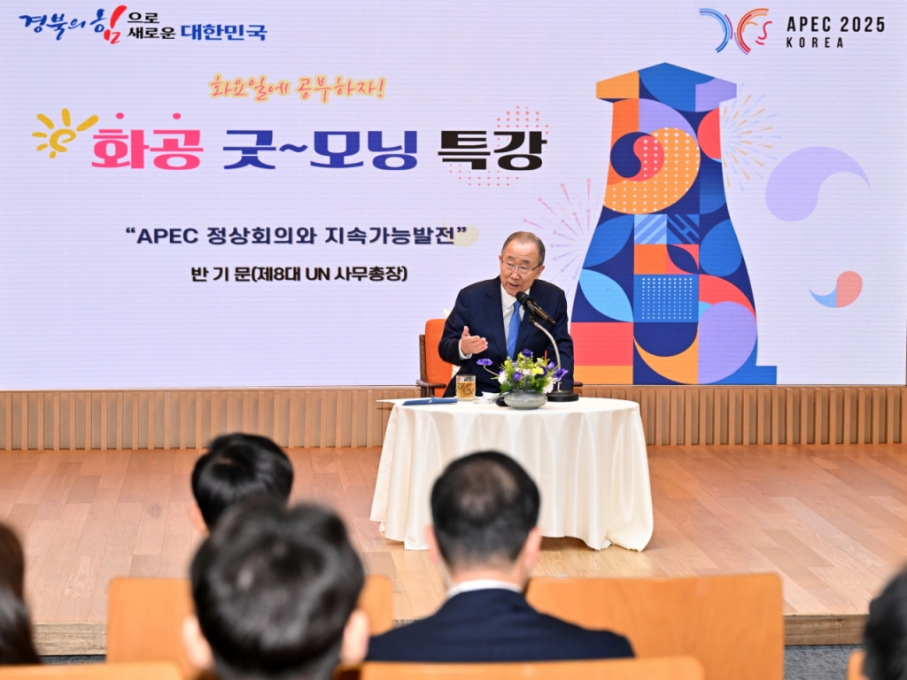 반기문 전 UN사무총장이 25일 경북도 '화공 굿모닝' 특강에서 "2025년 APEC 정상회의를 지속가능발전 기회로 삼아야 한다"고 밝혔다.