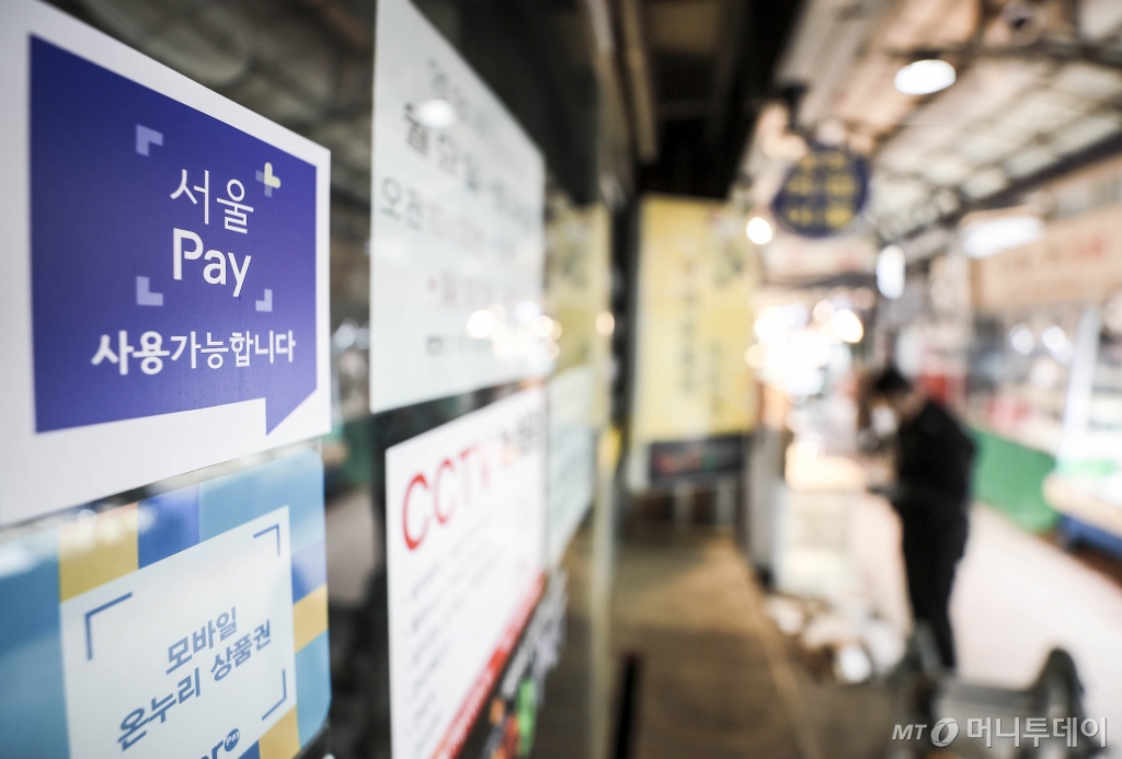 ![[서울=뉴시스] 정병혁 기자 = 8일 서울 서대문구 영천시장의 한 상점에 서울페이 사용 가능 스티커가 붙어 있다. 서울시는 설 명절을 맞아 지역 경제 활성화를 위해 2940억원 규모의 '서울사랑상품권'을 5% 할인된 금액에 판매한다고 밝혔다. 지역상품권은 오는 14일부터 16일까지 3일간 자치구별로 발행한다. 이번 발행하는 상품권은 각 자치구 내 가맹점에서만 사용 가능하다. 서울사랑상품권은 '서울페이플러스(서울pay+)'에서 5% 할인된 금액으로 1인당 월 50만원까지 구매할 수 있으며, 보유 한도는 1인당 150만원이다. 2025.01.08. jhope@newsis.com /사진=정병혁](https://thumb.mt.co.kr/cdn-cgi/image/f=avif/21/2025/03/2025030421293558122_1.jpg)