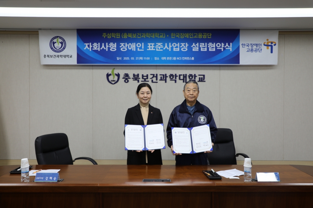 충북보건과학대학교 학교법인 주성학원이 27일 대학본부 대회의실에서 한국장애인고용공단 충북지사와 자회사형 장애인 표준사업장 설립을 위한 업무협약을 체결했다.