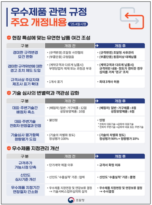 조달청이 '우수조달물품제도'와 관련, 현장 특성에 맞는 유연한 납품 여건을 조성해 업체의 불편과 부담을 완화하고 우수제품 심사 방식 변경 및 정량평가도 도입해 기술 심사의 변별력과 객관성을 높이기로 했다. 기업하기 좋은 환경을 만들기 위해 관련 규정을 손질했다.