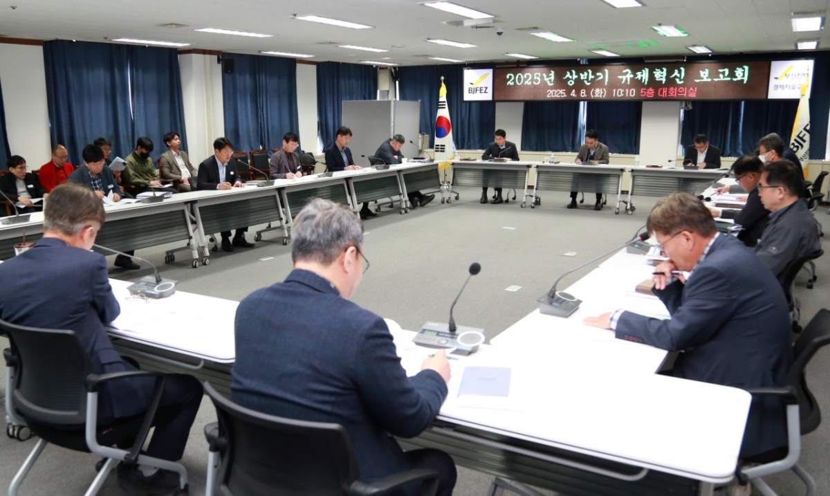 부산진해경제자유구역청이 8일 '규제개선 추진상황 보고회'를 열고 11대 핵심 규제개선 과제를 선정했다. 이를 해결하기 위한 '핵심 규제 대응 TF'도 본격 운영에 들어갔다.