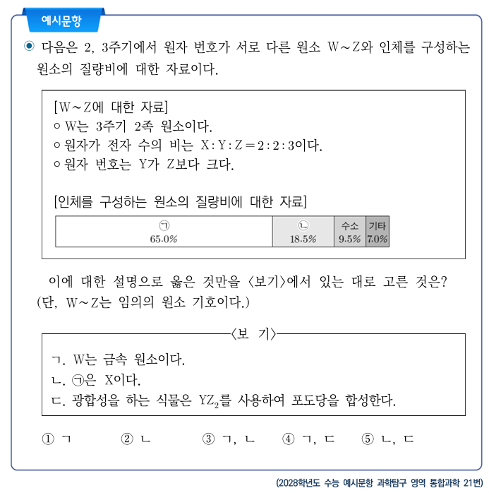 2028학년도 수능과목 변동으로 국어‧수학‧사회‧과학 영역의 전체 예시문항도 개발해 공개한다. 국어와 수학은 선택과목이 폐지되고 문항수와 시험시간은 현행과 동일하다. 사회탐구와 과학탐구는 선택과목이 폐지되고 '통합사회'와 '통합과학'이 출제돼 변화가 가장 크다. 각각 25문항 40분으로 운영된다. 예시 문항은 평이한 수준으로 개발됐으며 한국교육과정평가원과 대학수학능력시험 누리집에서 누구나 확인할 수 있다.