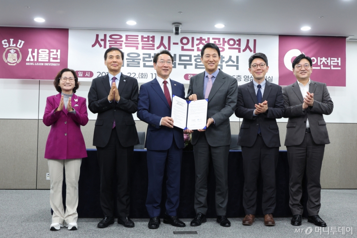 서울시는 22일 오전 인천시와 '교육격차 해소를 위한 업무협약'을 체결하고 '서울런' 플랫폼 공동 활용과 운영 노하우 공유 등에 협력하기로 했다. 이날 서울시청에서 열린 협약식에는 오 시장과 유정복 인천광역시장이 참석했다.