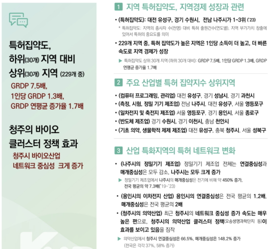 산업별 특허집약지수도 각 지역의 특성과 산업구조에 따라 뚜렷한 차이를 보였다. △컴퓨터 프로그래밍 분야는 대전 유성구와 경기 성남시 △정밀기기 제조업은 전남 나주시와 대전 유성구 △일·이차전지 산업은 서울 영등포구와 경기 용인시 △반도체는 경기 수원시와 이천시 △의약산업은 충북 청주시와 대전 유성구가 강세를 보였다.