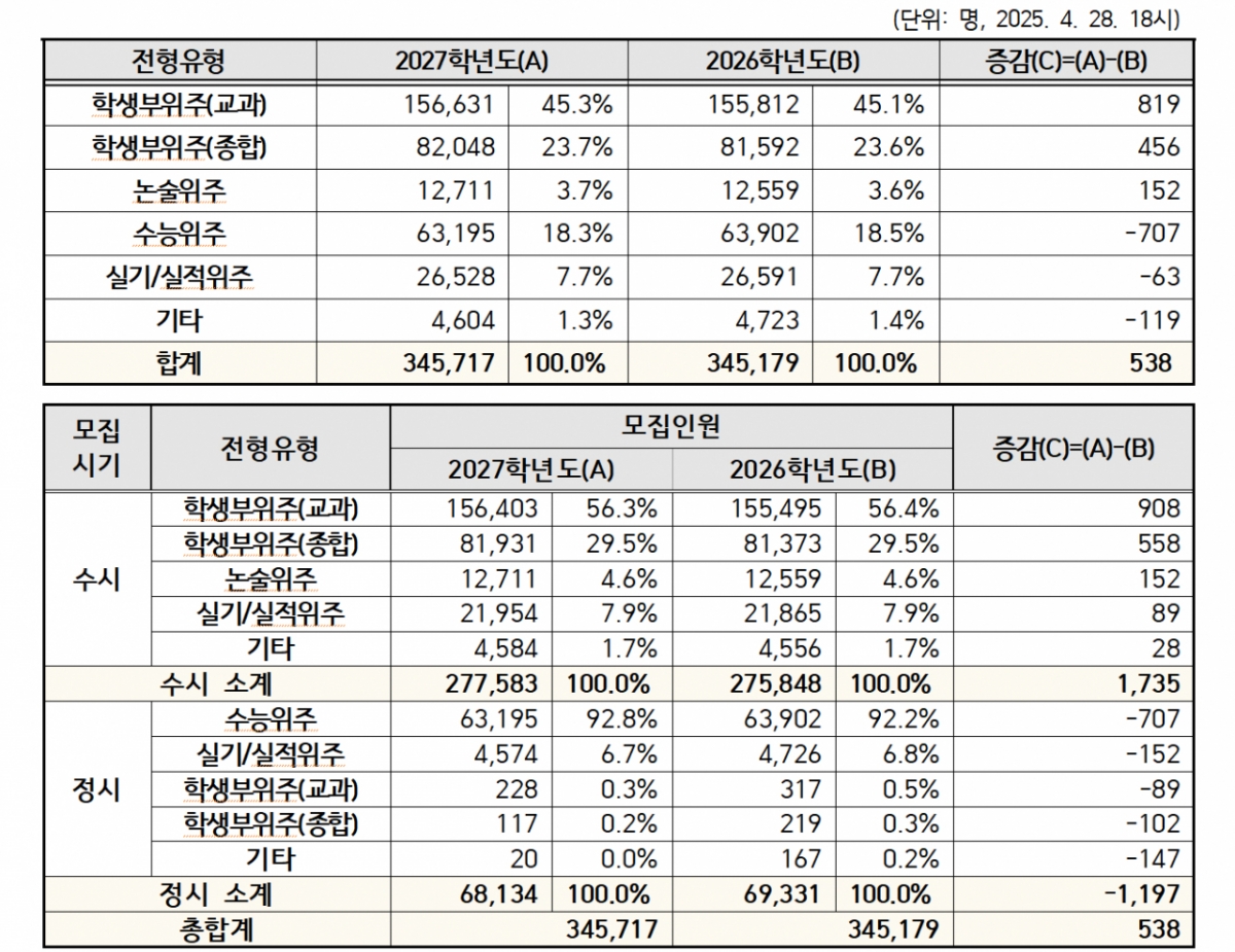 교육부와 한국대학교육협의회는 30일 전국 195개 회원대학이 제출한 '2027학년도 대학입학전형시행계획'안을 취합해 발표했다. 2027학년도 총 모집인원은 34만5717명으로, 2026학년도(34만5179명)에 비해 538명이 늘었다.