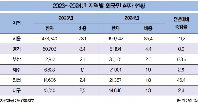 지역별로는 서울이 가장 많았다. 서울을 방문한 외국인 환자는 99만9642명으로 전체의 85.4%를 기록했다. 이 외에 △경기도(4.4%, 5만1184명) △부산(2.6%, 3만165명) △제주(1.9%, 2만1901명) △인천(1.8%, 2만1387명) 순으로 나타났다.