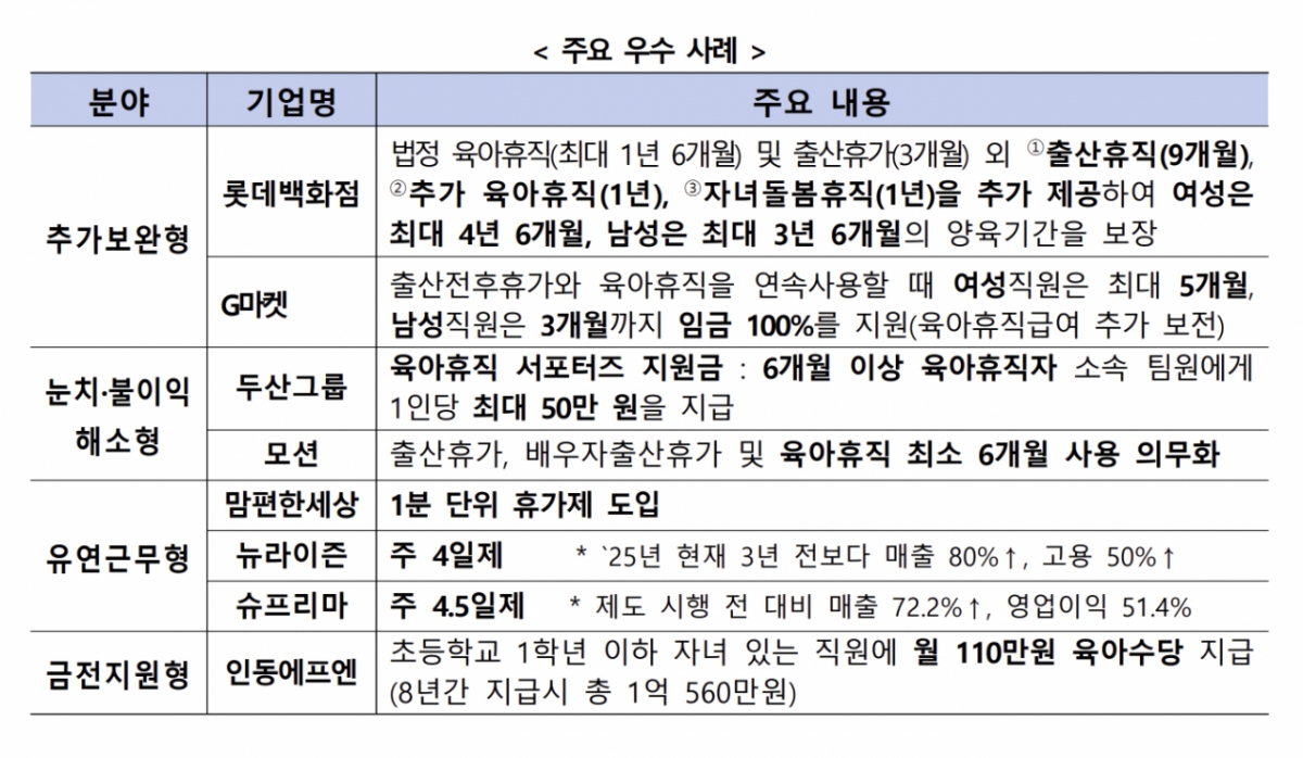 위원회는 각 사례를 △법정 제도 보완형 △눈치·불이익 해소형 △유연근무형 △금전지원형 △사회공헌형 등 다섯 가지로 분류했다.