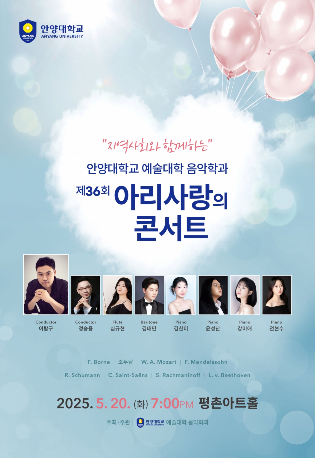 공연에는 심규현(플루트), 김태민(성악), 김찬미·윤성찬·강미애·전현수(피아노) 등 음악학과 재학생들이 참여한다. 이들은 이탐구 겸임교수(강남심포니오케스트라 부지휘자), 정승용 안양문화예술재단 과장의 지휘 아래 안양대 필하모닉 오케스트라와 협연할 예정이다.