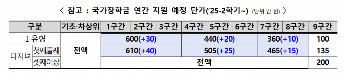 다만 해당 인상액은 '연간' 지원 단가로 이번 2학기에는 구간별 인상액의 절반이 적용될 예정이다. 예를들어 국가장학금Ⅰ유형 1~3구간은 15만 원, 4~6구간 10만 원, 7~8구간 5만원을 인상해 지원하는 셈이다.