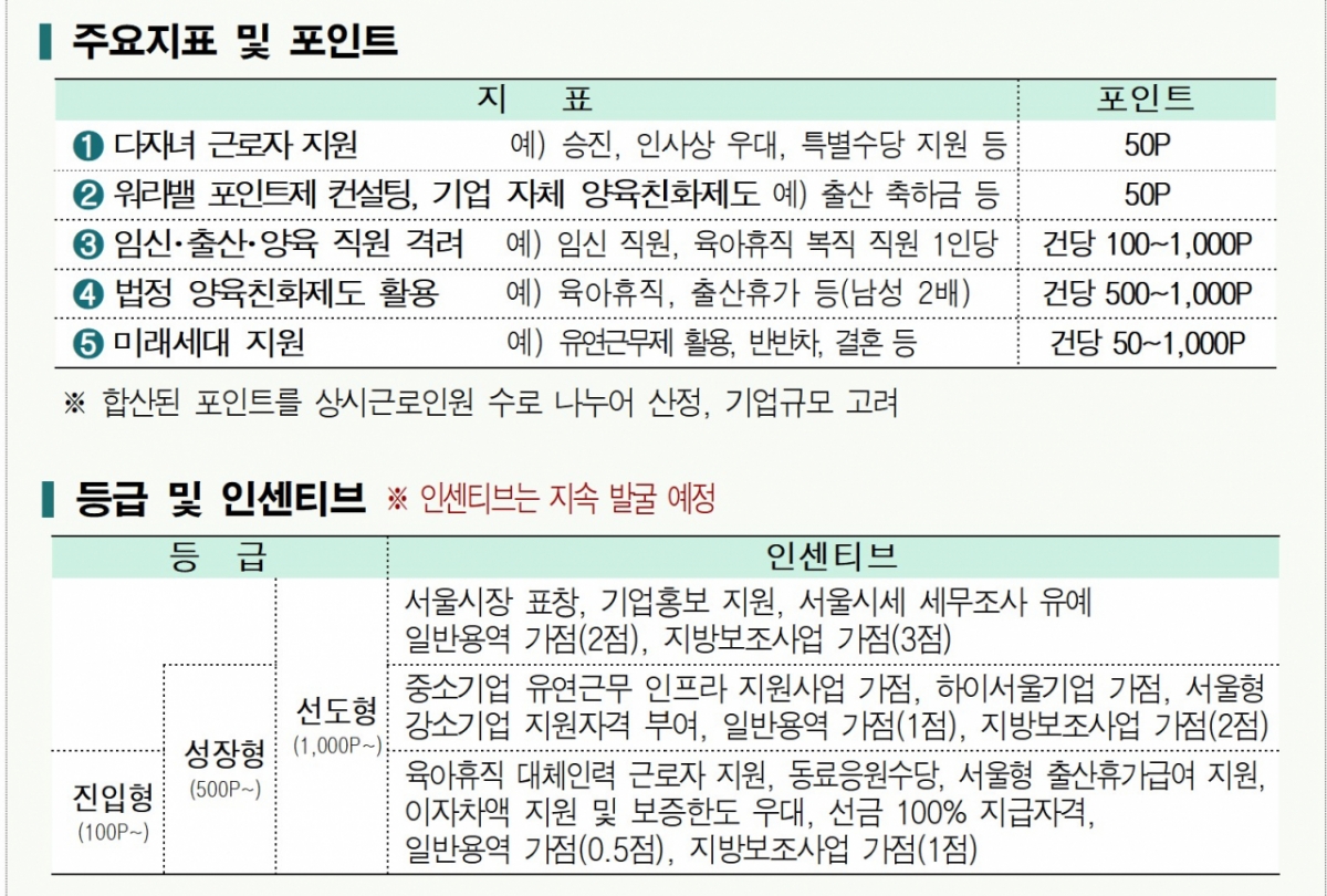 서울시 중소기업 워라밸 포인트제는 출산·양육과 관련된 중소기업의 어떤 시도와 노력도 인정해 인센티브를 제공한다. 사유나 결재 없는 연차 사용, 격주 주 4일제, 재택근무 장려 등 기업에서 자체적으로 시행하고 있는 제도면 포인트를 지급한다. 결혼·출산·양육 직원이 많을수록 더 많은 포인트를 받을 수 있다.