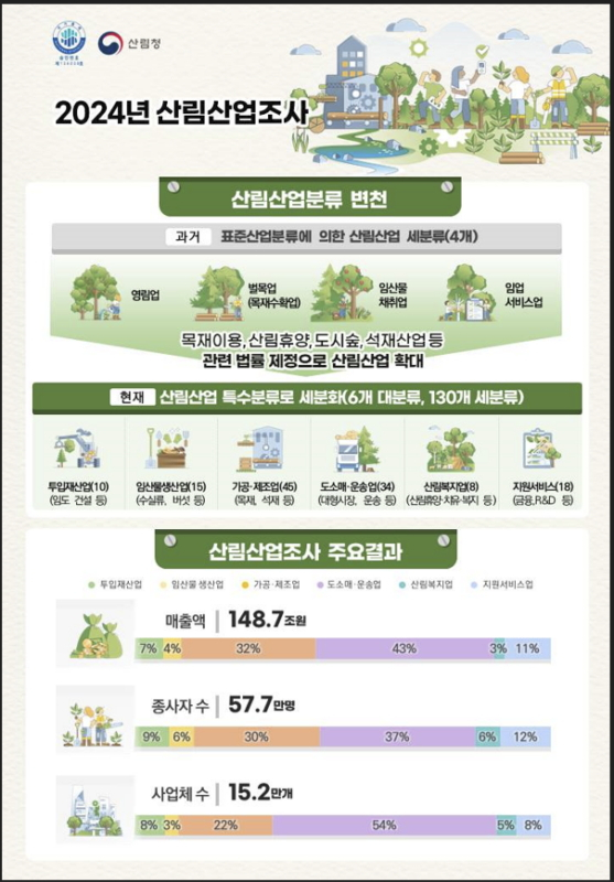 이에 따라 산림청은 2020년 '산림산업특수분류'를 통해 산림산업을 130개 세분류로 새롭게 제정하고, 2022년 5300개 업체 대상 시범조사를 실시했다. 2023년에는 표본 크기를 1만3000개로 확대해 신뢰도를 높였다. 그 결과 통계청으로부터 품질을 인정받아 국가승인통계(제136038호 2023년) 지정을 받았다.