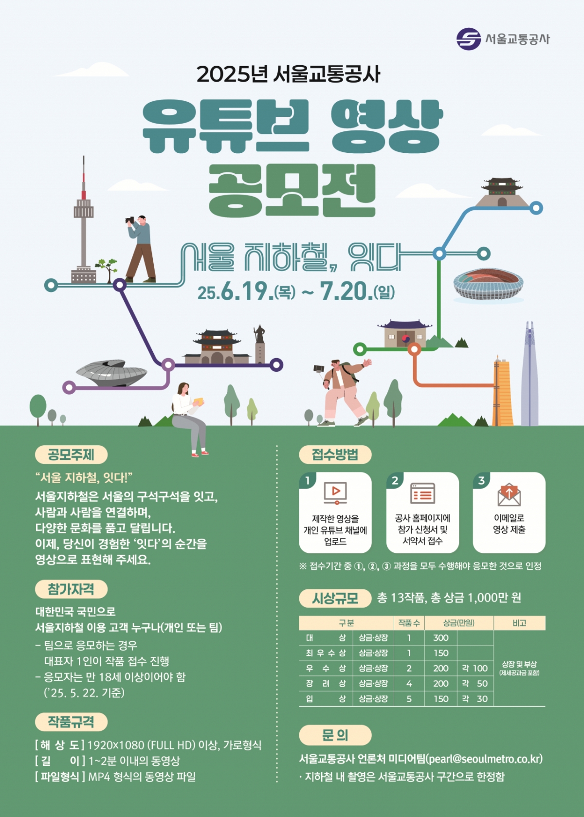 공모전의 주제는 '서울지하철, 잇다!'로 서울지하철이 교통수단을 넘어 '연결의 상징'으로 어떤 역할을 해왔는지를 영상으로 자유롭게 표현하면 된다. 서울지하철 구간을 이용하는 국민이라면 누구나 참여할 수 있으며, 개인 또는 팀 단위로 최대 2편까지 출품할 수 있다.