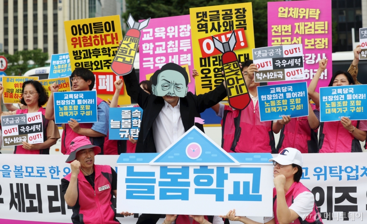 ![[서울=뉴시스] 홍효식 기자 = 전국학교비정규직노동조합원들이 10일 오전 서울 종로구 정부서울청사 앞에서 기자회견을 열고 리박스쿨 규탄 및 방과후수업 외주·위탁 운영 철폐를 촉구하는 퍼포먼스를 하고 있다. 2025.06.10. /사진=홍효식](https://thumb.mt.co.kr/cdn-cgi/image/f=avif/21/2025/06/2025061110313691720_1.jpg)