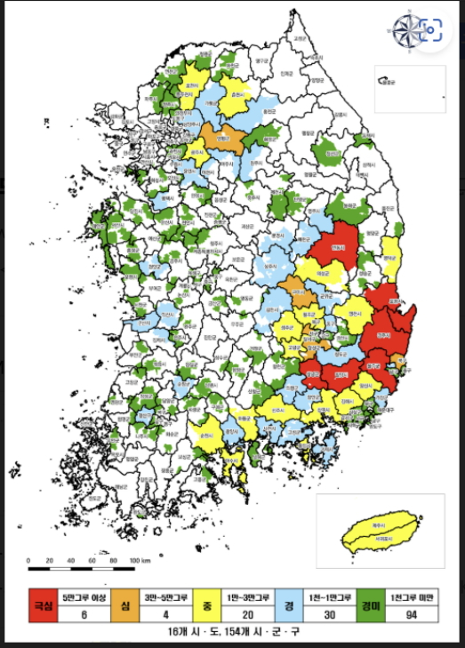 피해 정도 극심 또는 심지역이 지난해 7개에서 올해 10개로 늘어났으며, 이 지역의 감염목은 총 91만그루로 전체 발생의 65%를 차지했다.