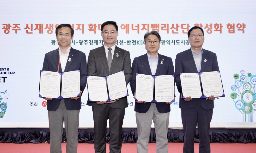 광주시는 9일 김대중컨벤션센터에서 광주경제자유구역청, 한전KDN, 광주도시공사와 '광주지역 신재생에너지 확대 및 에너지밸리산단 활성화를 위한 업무협약'(MOU)을 체결했다고 밝혔다.