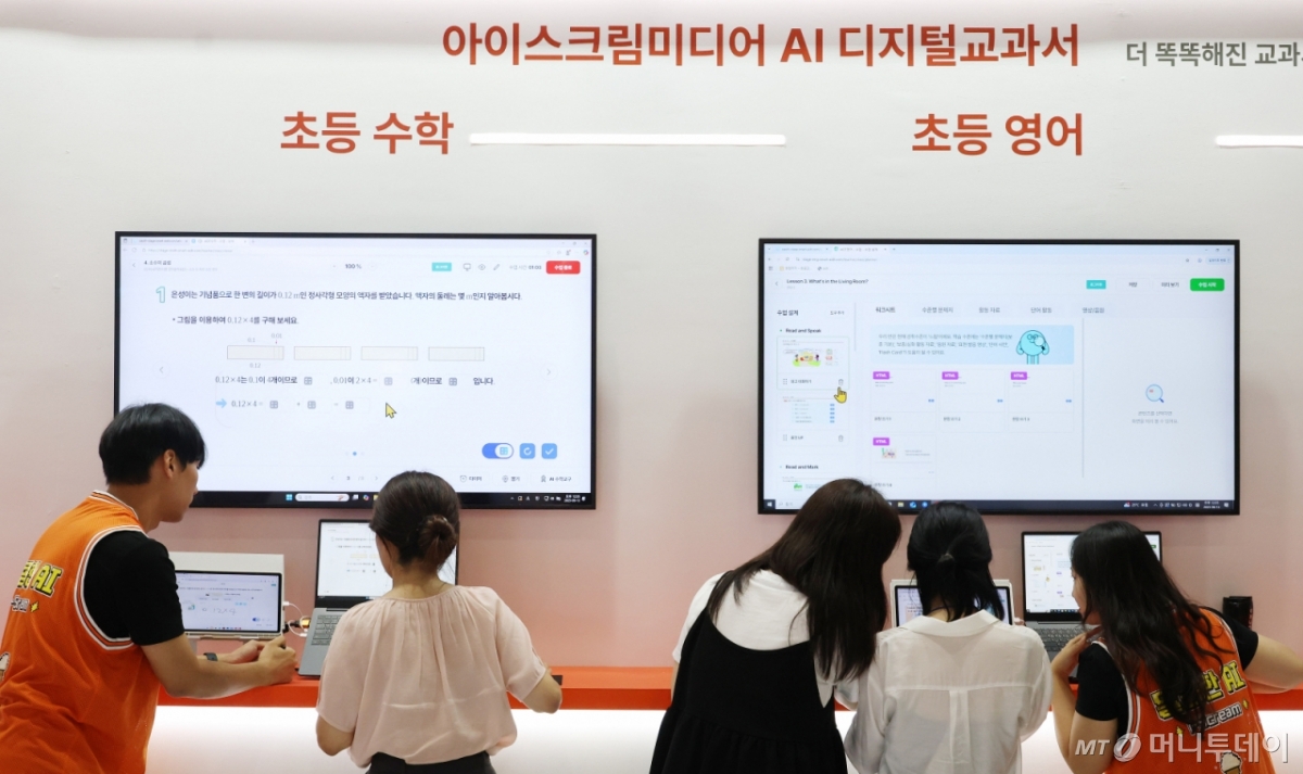 아이스크림미디어의 다양한 AI·에듀테크 솔루션이 전시된 코엑스 C홀 부스는 박람회 기간 내내 관람객들로 붐볐다. 박람회 첫날인 13일 관람객들은 '띵커벨', '미니북', 'AI 아크수학' 등을 직접 체험하기 위해 줄을 섰다.