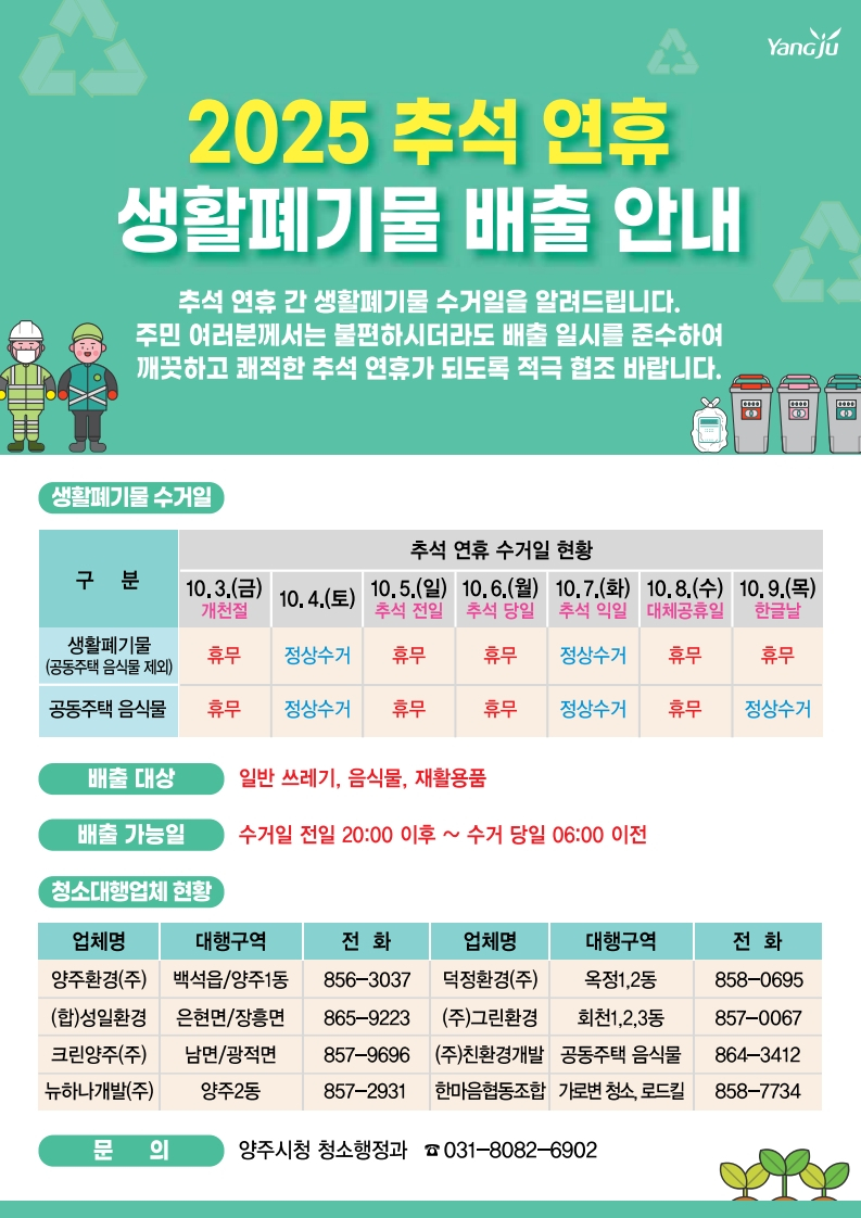 시 관계자는 "양주 시민과 귀성객 모두가 깨끗하고 쾌적한 추석 명절을 보낼 수 있도록 연휴 기간 발생하는 생활폐기물 줄이기에 동참해 주기 바란다"며 "생활폐기물은 정해진 수거 일정에 맞춰 배출해 달라"고 당부했다.