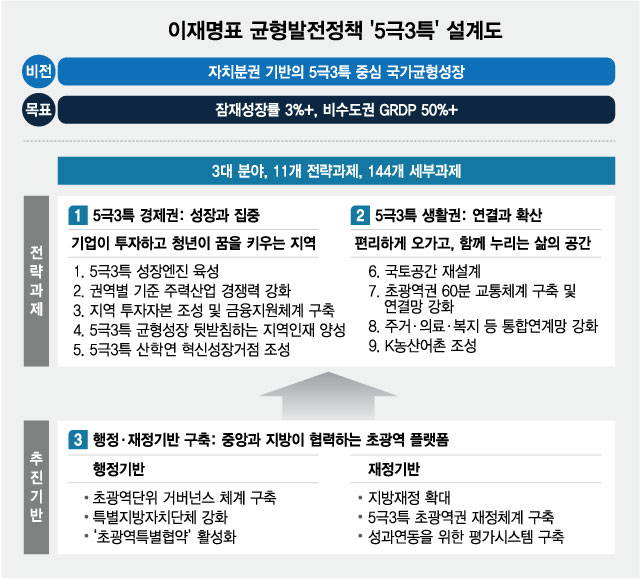 수도권 일극체제를 타파하고 권역별 성장거점을 육성하는 이재명표 균형발전 정책인 '5극3특'의 설계도가 공개됐다. 권역별로 새로운 성장엔진을 발굴해 부처와 시도간 칸막이를 넘어 통합적인 균형성장을 하겠다는 내용이다.