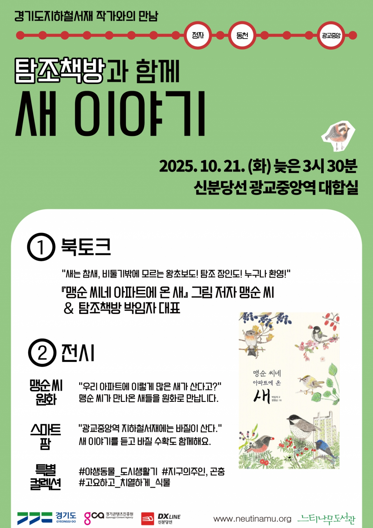경기콘텐츠진흥원과 느티나무재단은 오는 21일 오후 3시30분부터 5시까지 신분당선 광교중앙역 대합실 내 '지하철 서재'에서 '탐조책방과 함께 새 이야기' 북토크를 개최한다고 13일 밝혔다.