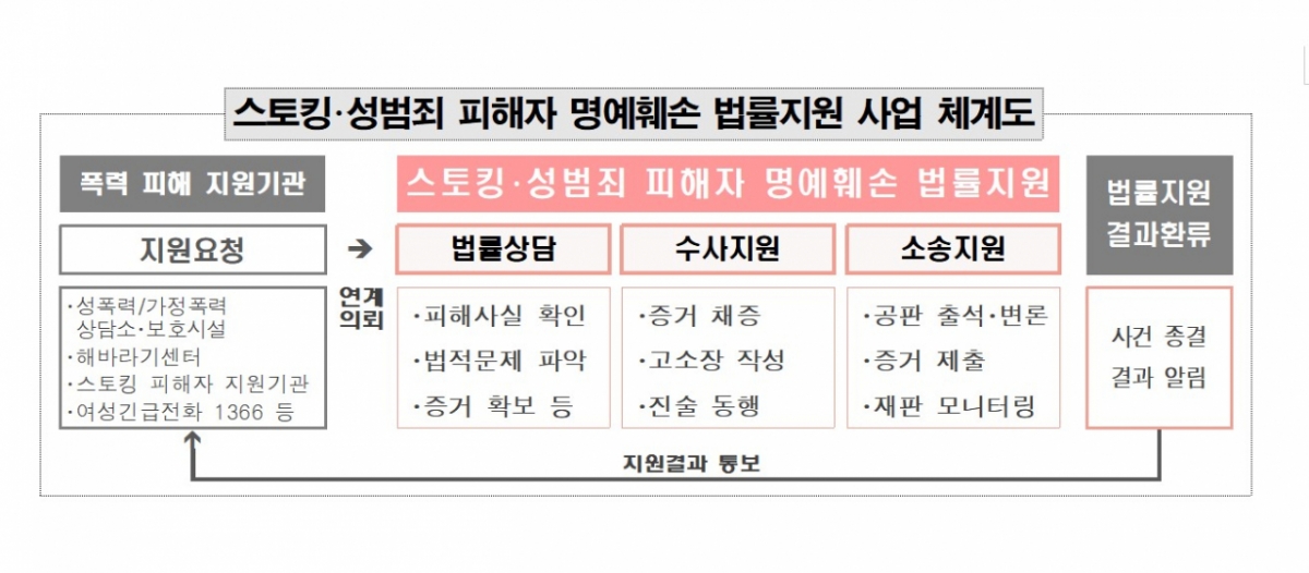 법률지원을 받고 싶은 경우 피해 지원기관을 통해 16일부터 신청할 수 있다. 자세한 사항은 법률지원 사업 수행기관인 ㈔한국여성변호사회(010-8558-9965, [email protected])로 문의하면 된다.