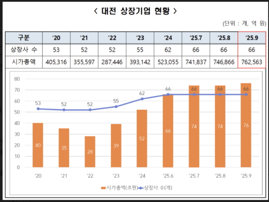 16일 대전테크노파크(이하 대전TP)에 따르면 지난달 말 기준 대전 상장기업 66개사의 시가총액은 76조2563억원으로 전월(74조6866억원) 대비 1조5697억원 증가한 것으로 집계됐다.