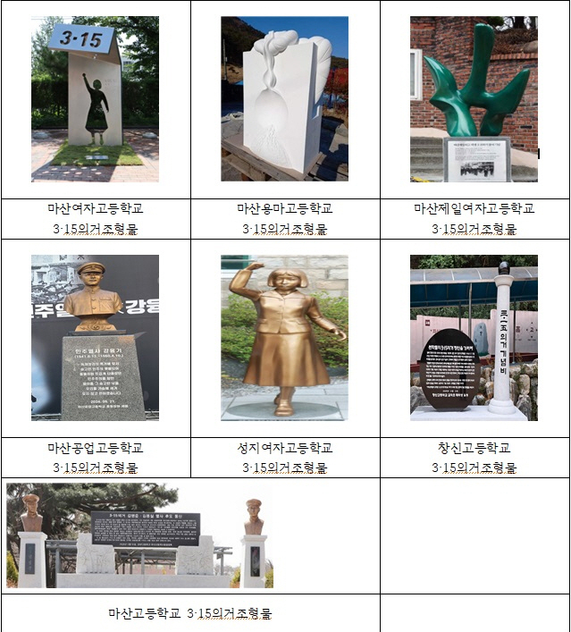 기념조형물은 3·15의거 당시 민주화 운동에 참여했던 마산 지역 7개 고등학교에 건립했다.