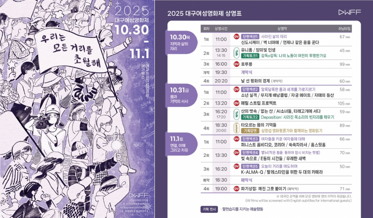 안숙영 대구여성영화제 집행위원장(계명대 여성학연구소장)은 "올해 영화제는 세대와 경계를 넘어 서로를 연결하는 마음을 담았다"며 "시민이 함께 만들어가는 문화적 실천의 장이 되길 바란다"고 말했다.