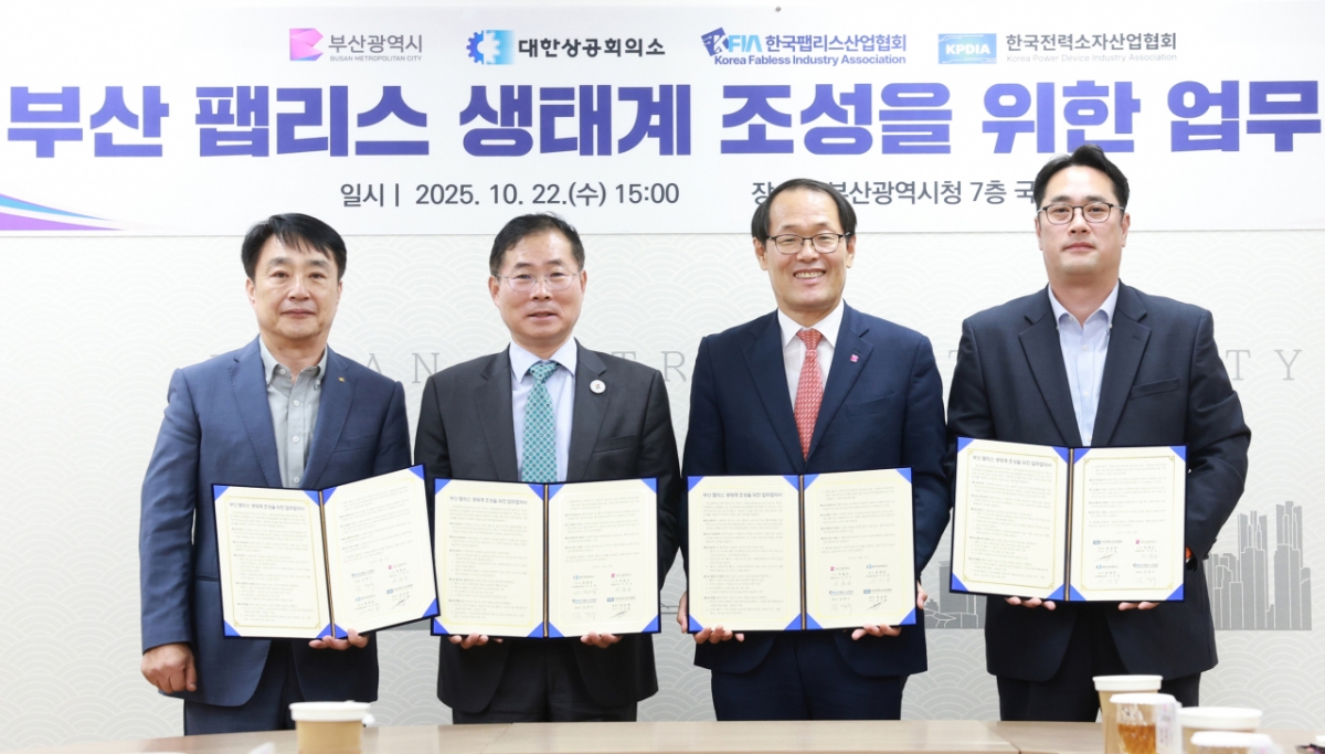 부산시가 22일 대한상공회의소·한국팹리스산업협회·한국전력소자산업협회와 부산 팹리스 생태계 조성을 위한 업무협약을 체결했다.
