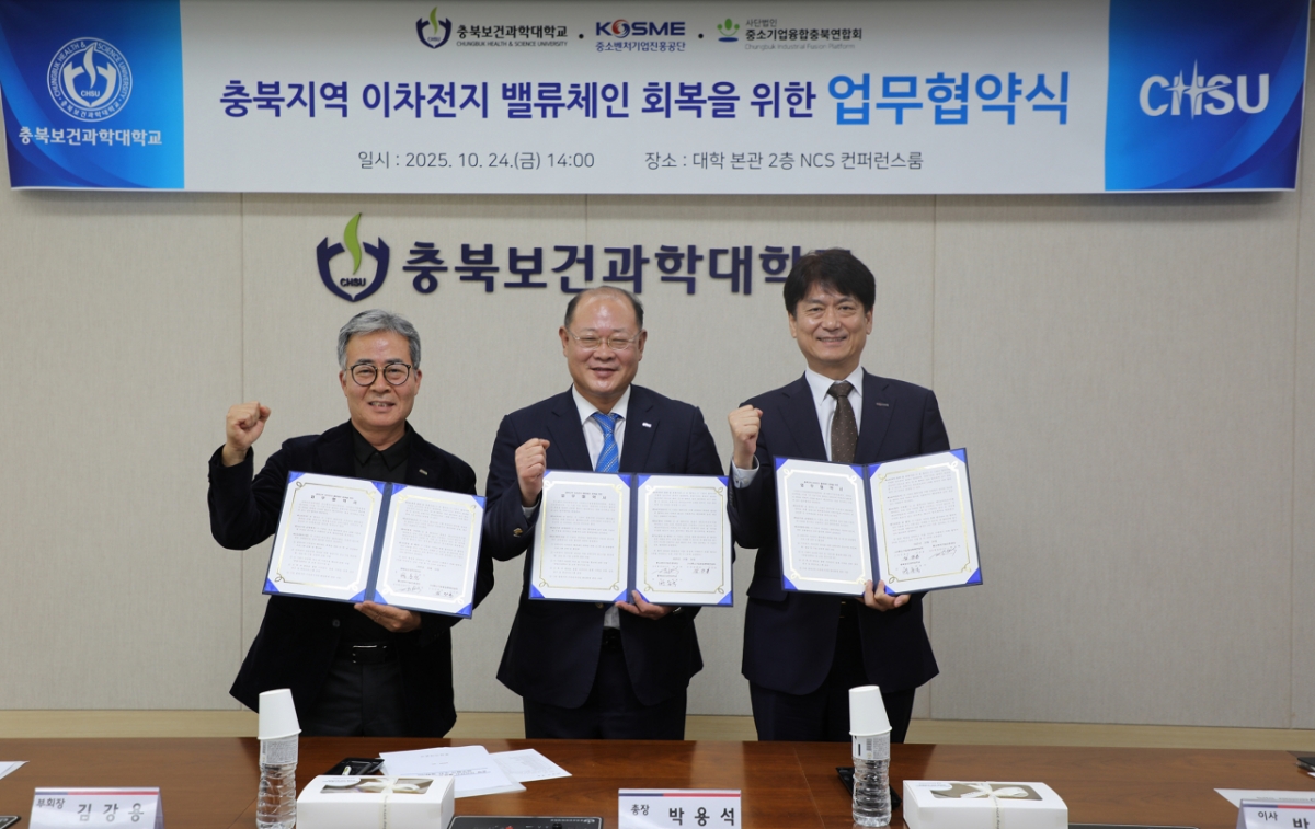 충북보건과학대학교가 지난 24일 중소벤처기업진흥공단, (사)중소기업융합충북연합회 충북지역본부와 산학협력 및 지역산업 인재 양성을 위한 업무협약(MOU)을 체결했다고 27일 밝혔다.