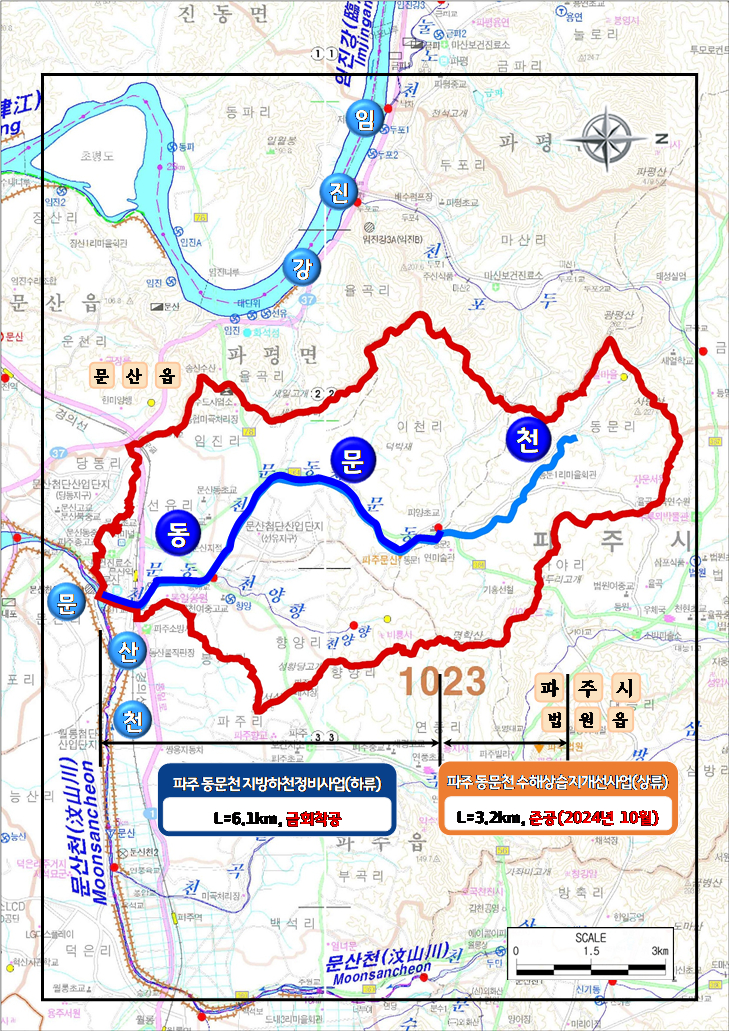 파주시 문산읍 선유리에서 법원읍 동문리에 이르는 동문천 일원 총 연장 6.1km 구간 하천에 △축제공(제방 쌓기) 6.1km △보축(제방 보수·보강)2.4km △교량 5개소 설치 등의 사업을 벌인다.