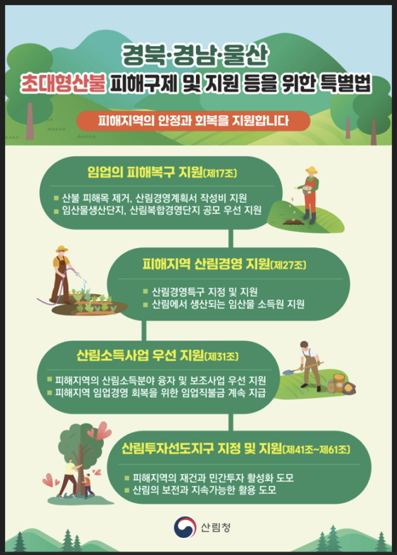 산림청은 지난 3월 영남지역에 막대한 피해를 남긴 경북·경남·울산 초대형산불피해 지원을 위한 '경북·경남·울산 초대형산불 피해구제 및 지원 등을 위한 특별법'(이하 특별법)이 28일자로 공포·시행된다고 밝혔다.