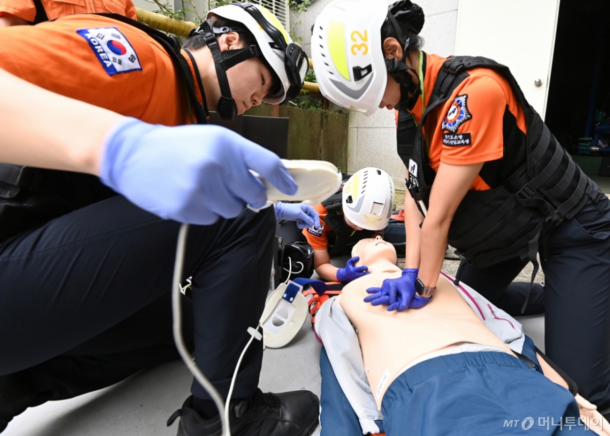 ![[용인=뉴시스] 김종택 기자 = 24일 경기 용인시 남사면 경기도 소방학교에서 열린 구급 출동 종합시뮬레이션(LETS:렛츠)에 참가한 소방학교 신임교육생들이 중증외상,심뇌혈관 질환 등 실제 응급상황을 가정한 구급교육 훈련을 하고 있다. 2025.09.24. jtk@newsis.com /사진=김종택](https://thumb.mt.co.kr/cdn-cgi/image/f=avif/21/2025/10/2025102909174654081_1.jpg)