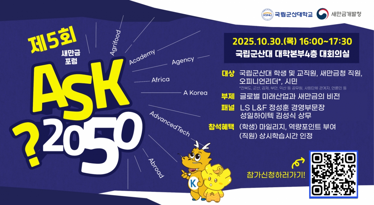 국립군산대학교가 30일 오후 4시 대학본부 4층 대회의실에서 새만금개발청과 함께 '제5회 ASK 2050 새만금 포럼'을 개최한다.