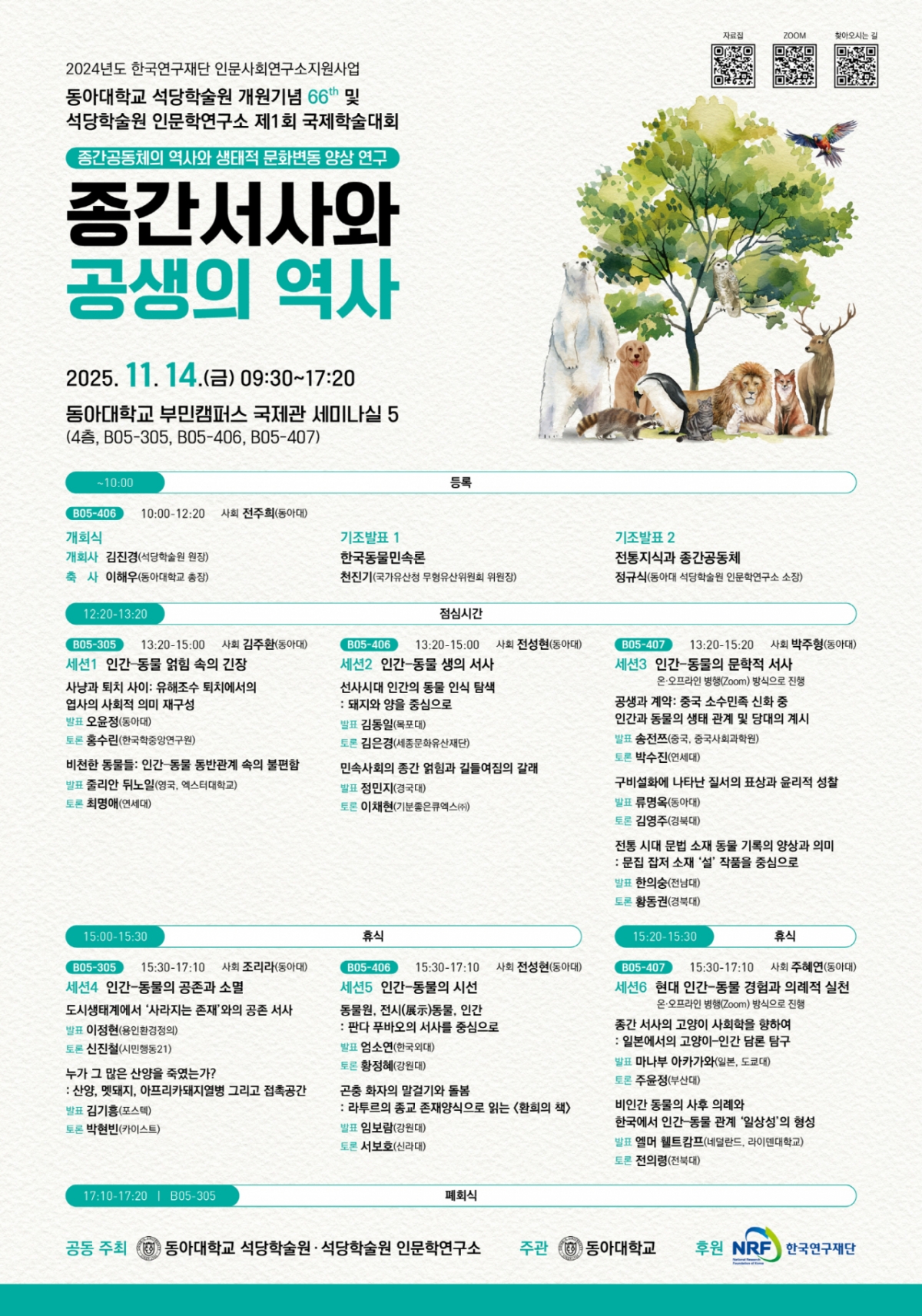 이후에는 △인간-동물 얽힘 속의 긴장 △인간-동물 생의 서사 △인간-동물의 문학적 서사 △공존과 소멸 △시선 △현대 경험과 의례적 실천 등 6개 분과 세션이 진행된다.