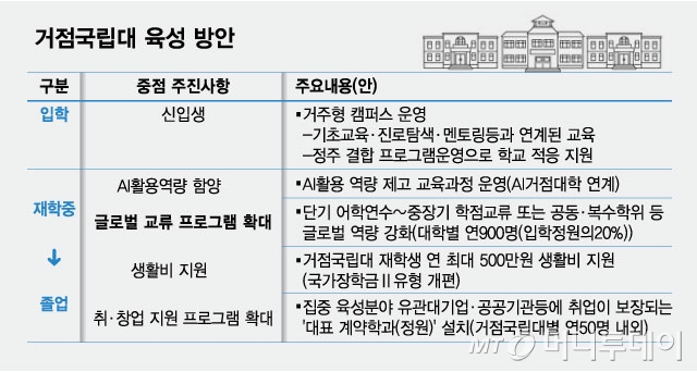 학부 단계에서 거점국립대의 교육경쟁력을 강화하기 위한 복안으로는 AI교육과 거주형 캠퍼스(RC) 등이 꼽힌다. 학생들의 AI 활용역량을 제고하기 위한 교육과정을 각 대학에서 운영하고 이를 추후 선정할 AI거점대학과 연계한다는 방침이다.