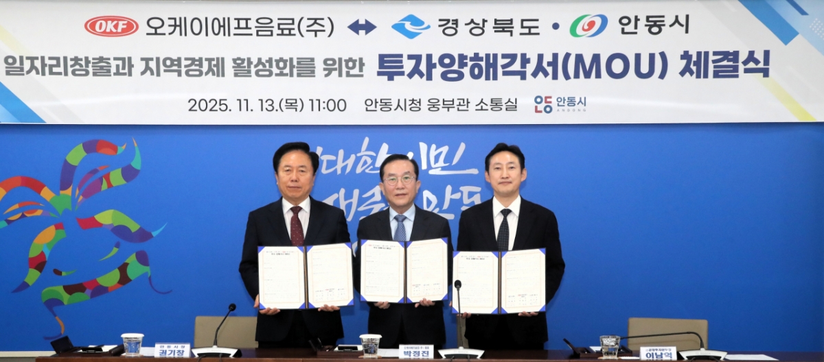 경북도와 안동시는 13일 안동시청에서 글로벌 음료 제조 전문기업인 OKF음료㈜와 음료 제조공장 증설을 위한 투자양해각서를 체결했다.