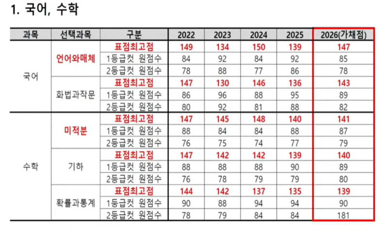국어 언어와 매체는 85점, 화법과작문은 89점, 수학 미적분은 87점, 기하는 89점, 확률과 통계는 90점으로 예상했다. 영어는 1등급 비율이 5.5%가 될 것으로 추정했다.
