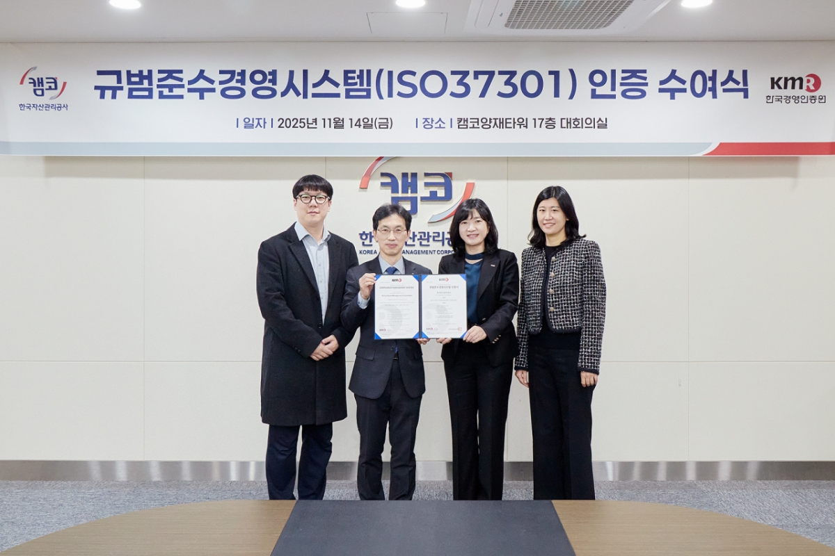 김서중 캠코 부사장은 "이번 인증은 준법·윤리경영을 위한 내부통제와 위기관리 체계를 구축하고 효과적으로 운영하고 있음을 인정받은 것"이라며 "규범준수 경영시스템을 견고히 하고 내부통제 역량을 지속 강화하겠다"고 말했다.