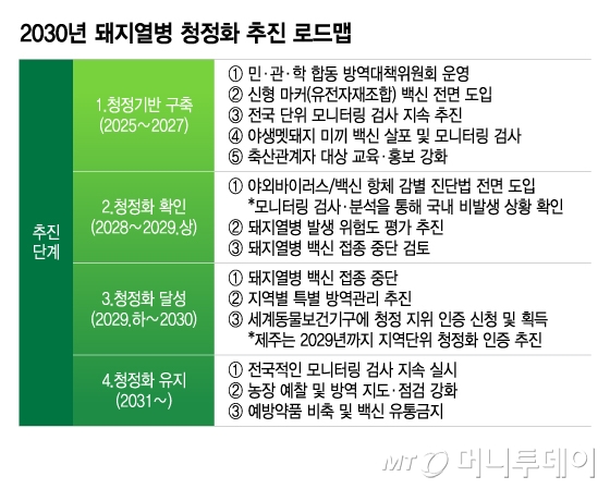 2029년 하반기부터 2030년까지는 '청정화 달성' 단계다. 위험도 평가 결과 바이러스 순환이 없을 경우 전국 양돈농장에 마커백신 공급을 중단하고 지방정부별로 특별 방역관리를 추진한다. 이를 통해 WOAH로부터 청정국 지위인증을 획득한다는 구상이다. 제주도는 1년을 앞당겨 2029년까지 지역단위 청정화를 추진할 계획이다.