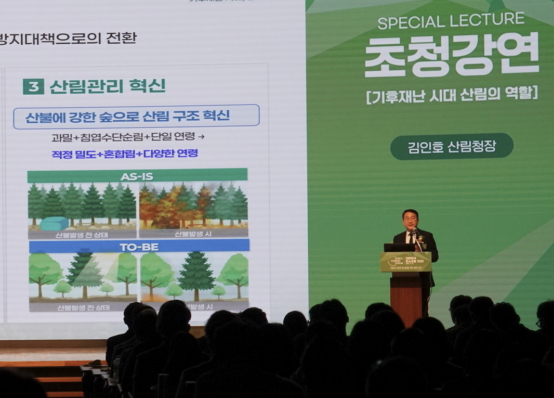 김인호 산림청장이 24일, '대한민국 탄소포럼 2025'에 참석해 기후재난 시대 산림의 역할을 주제로 초청강연을 하고 있다./사진제공=산림청 김인호 산림청장이 24일, 대한상공회의소에서 개최된 '대한민국 탄소포럼 2025'에 참석해 기후재난 시대 산림의 역할을 주제로 초청강연을 했다. 김 청장은 산불, 산사태, 폭염, 호우 등 기후재난에 맞서기 위해 산림이 가지는 탄소감축 등의 역할을 살펴보며 국민이 주도적으로 참여해 산림의 가치를 증진시키는 방법에 대해 제안했다. 독자들의 PICK! "죽은 친구 아내 짝사랑한 남편"...눈치챈 아내 말렸지만 '고백' "어느 놈이랑 잤냐"...아내 외도 확인한다며 추행한 남편 '말기암' 60대, 재혼 아내에 660억 상속…전처 자녀들은 '0원' 왜 윤미래, 뒤늦게 알려진 사망 소식..."긴 여행 떠나"
