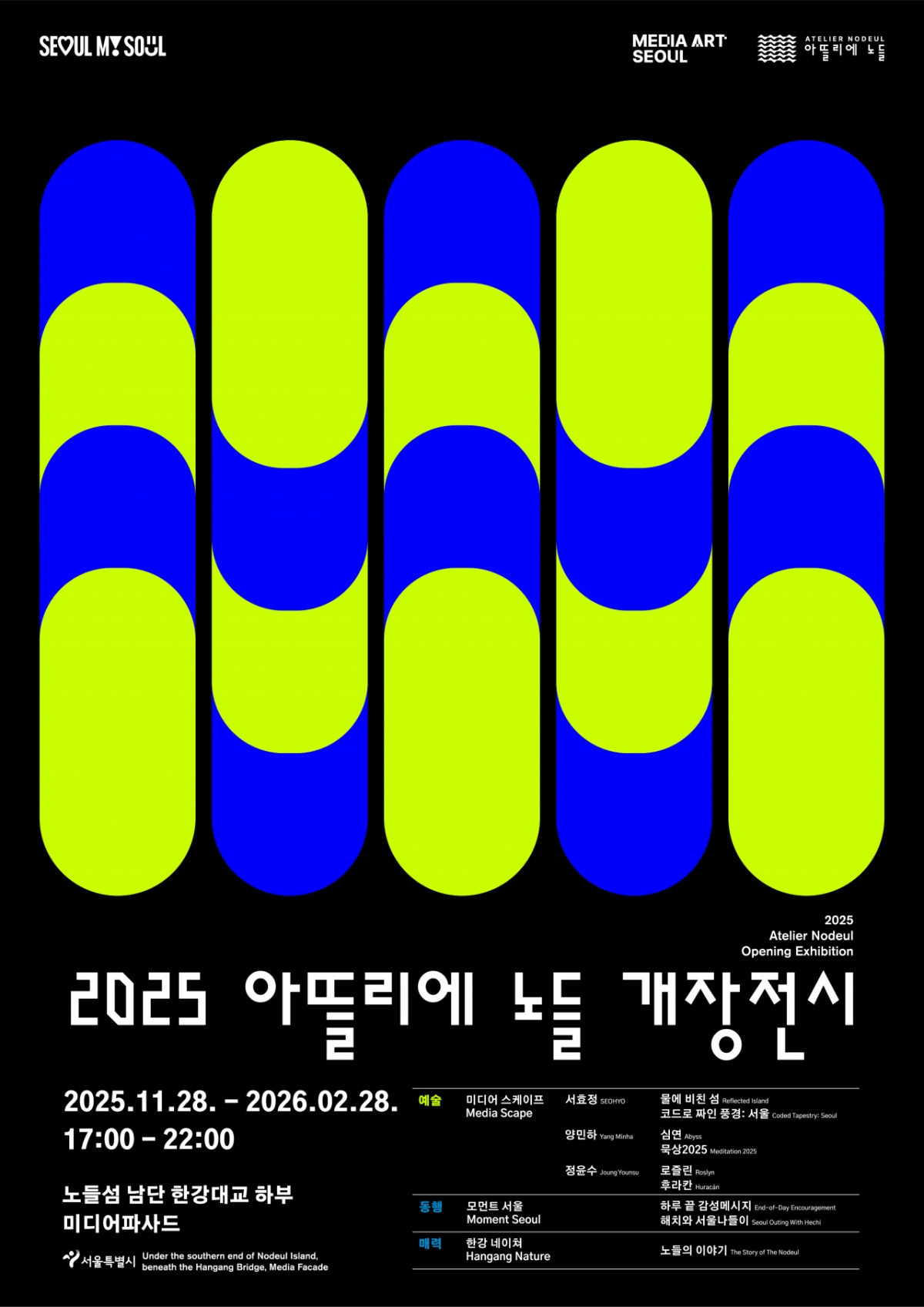 서울시는 한강 중심부 노들섬 남단 한강대교 하부에 공공 미디어아트 전시플랫폼 '아뜰리에 노들'을 오는 28일 개장한다고 25일 밝혔다. 전시플랫폼은 내년 2월 28일까지 매일 오후 5시부터 10시까지 운영된다.