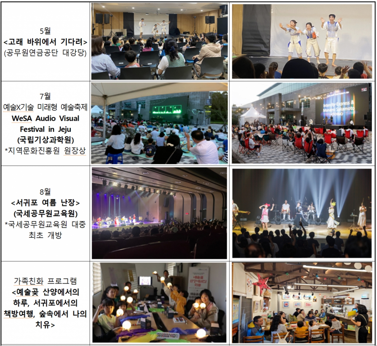 2024년 한 해 동안 서귀포 혁신도시 일원에서는 연극, 음악콘서트, 버스킹, 동화쓰기 클래스, 가족친화 프로그램, 거리예술축제 등 모두 41회의 문화예술 프로그램이 열렸다.