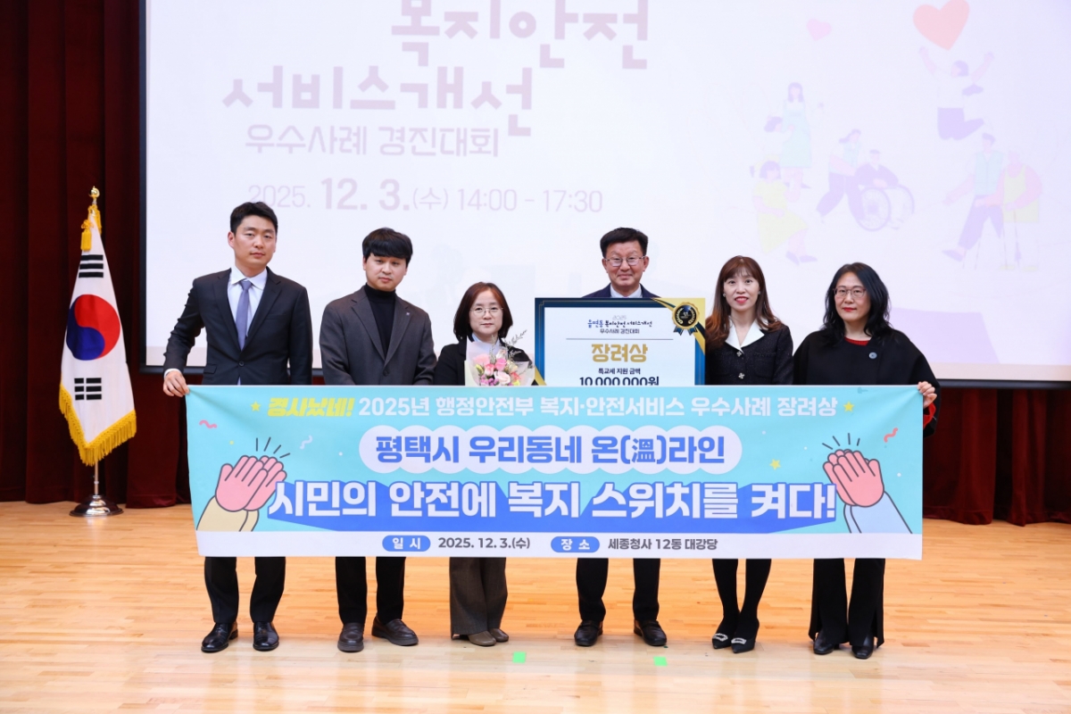 경기 평택시가 취약계층 안전망 강화 성과를 인정받아 '읍면동 복지·안전 서비스 개선 우수사례 공모전'에서 행정안전부 장관상을 수상했다고 4일 밝혔다. 이번 수상으로 특별교부세 1000만원도 확보했다.