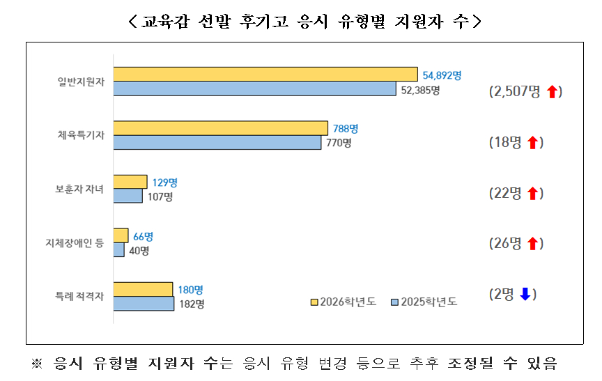 응시 유형별로는 일반지원자 5만4892명, 체육특기자 788명, 보훈자 자녀 129명, 지체장애인 등(근거리통학 대상자) 66명, 특례 적격자 180명이다.