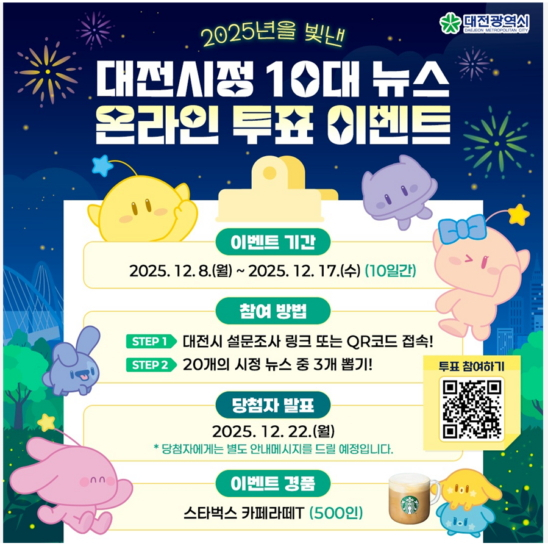 대전시는 오는 17일까지 '2025년을 빛낸 대전시정 10대 뉴스' 투표를 진행한다고 8일 밝혔다.