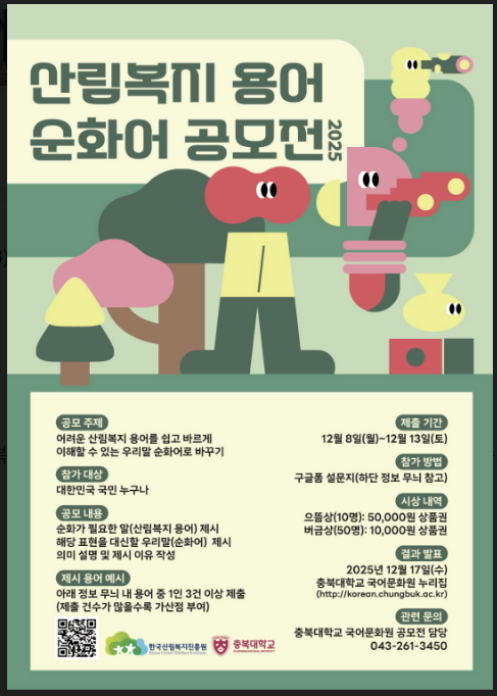 이번 공모전은 (사)국어문화원연합회의 '2025년 국어책임관 활성화 지원 사업'의 하나로 진행된다. 어려운 산림복지 용어를 국민이 쉽고 바르게 이해할 수 있는 순화어로 바꾸기 위한 취지를 담았다.