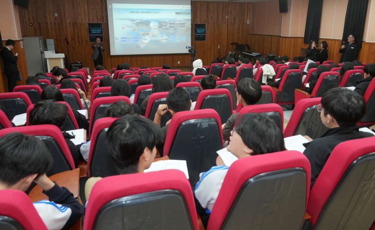 박성호 부산진해경제자유구역청장이 8일 창원특례시 진해구 용원중학교에서 진해의 미래와 비전을 주제로 특별강연을 했다.