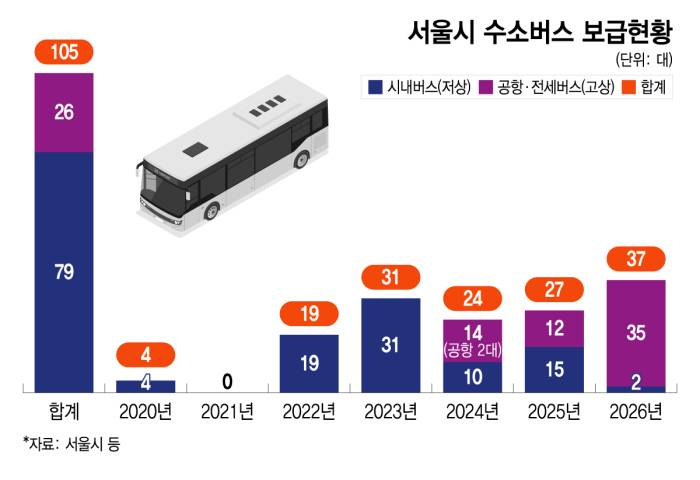 22일 서울시 등에 따르면 수소모빌리티의 핵심 사업으로 기대를 모았던 공항버스는 사업 첫해 시범 도입한 2대 이후 추가 도입이 중단됐다. 계획대로면 올해까지 공항버스의 70% 수준인 300여대가, 2030년까지 450대 전체가 수소버스로 전환될 예정이었다. 공항버스는 하루 평균 548㎞를 달려 시내버스(229㎞)보다 주행거리가 길고, 대형 경유버스는 승용차 대비 온실가스 30배·미세먼지 43배 이상을 배출한다는 점에서 '상징 사업'으로 꼽혔다.