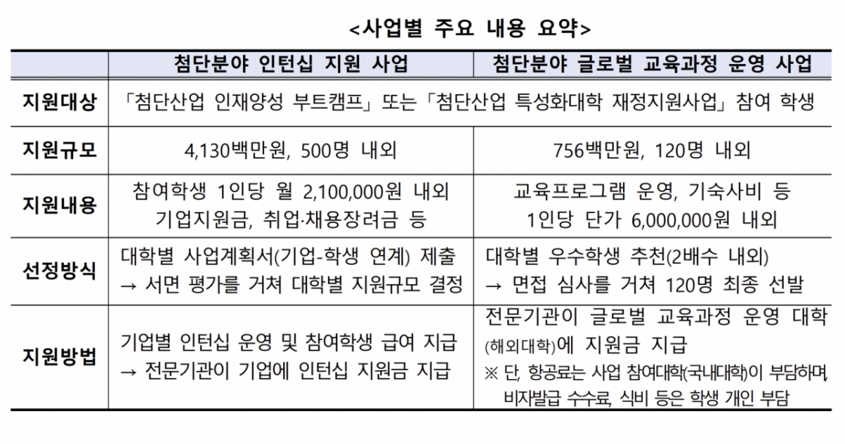 모집은 인턴십 지원사업과 글로벌 교육과정 운영사업으로 나눠 이뤄진다. 두 사업의 대상은 교육부가 운영 중인 '첨단산업 인재양성 부트캠프'와 '첨단산업 특성화대학 재정지원 사업' 참여자 중 우수 인재로 꼽힌 학생이다.